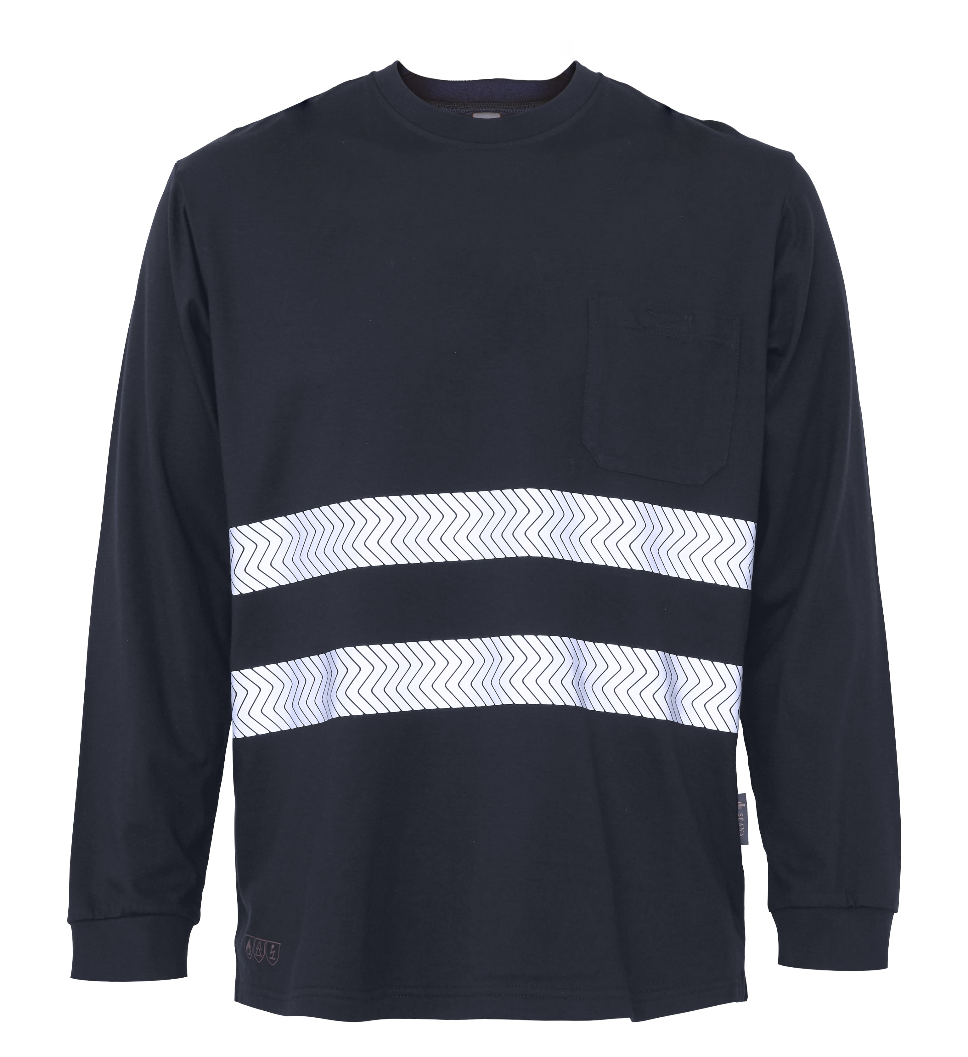 Long-sleeved flatweave t-shirt, fire retardant-ATEX. Round neck. 1 pocket with Velcro on chest. Cuffs elastic. 2 reflective stripes heat-sealed segmented fire-proof on body