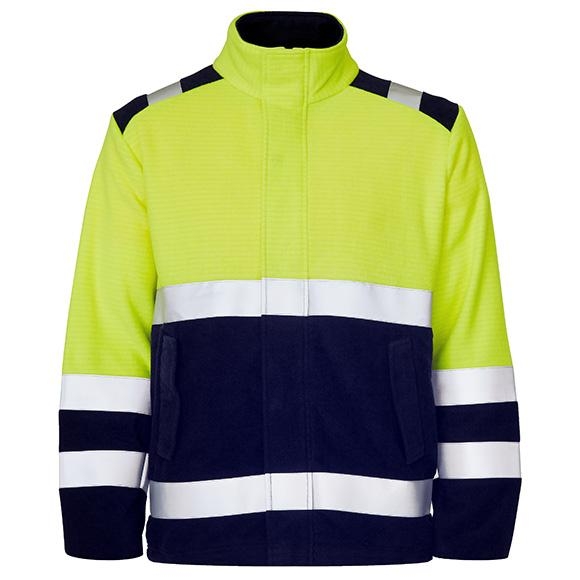 Fleece jacket ig-atex high visibility. Hidden central zip, dos lower pockets with central zip with hidden clip button flap, 1 pocket vertical on chest, girdle at the waist, flaps elastic. 2 fire-proof reflective stripes on body and sleeves. 2 fire-froof reflective stripes on yoke.