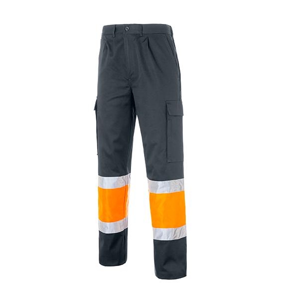 Multipocket bicolour trousers with 1/2 elastic waist, 2 front slant pockets, watch pocket, 1 back patch pocket with clip button, 2 side bellow patch pocket with Velcro flap on each leg. Lining in the same fabric. 2 reflective stripes.