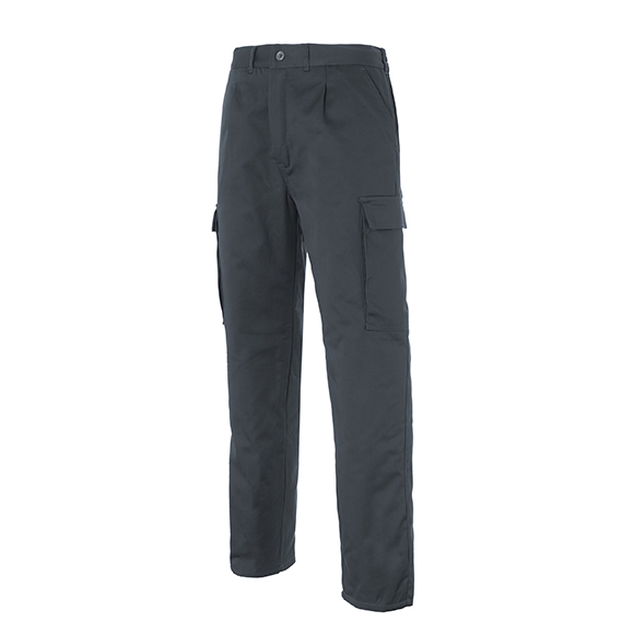 Trousers 1/2 elastic waist at back, 2 front slant pockets, watch pocket, 1 back patch pocket with clip button, 2 side bellow patch pocket with Velcro flap on each leg. Inside padding. Lining in the same fabric.
