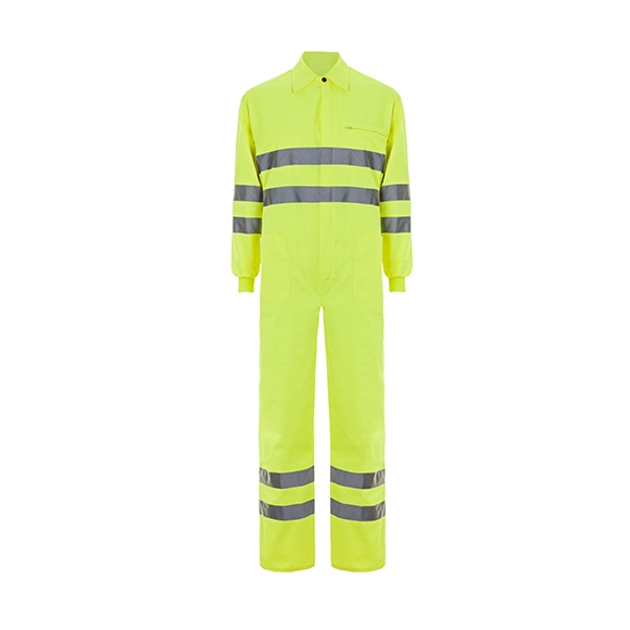 Monocolour Overall with hidden straight central zip, 1 slit chest pocket with zip, 2 lower patch pockets, 1 back patch pocket, elastic in back, elastic cuffs. 2 reflective stripes on body and sleeves.