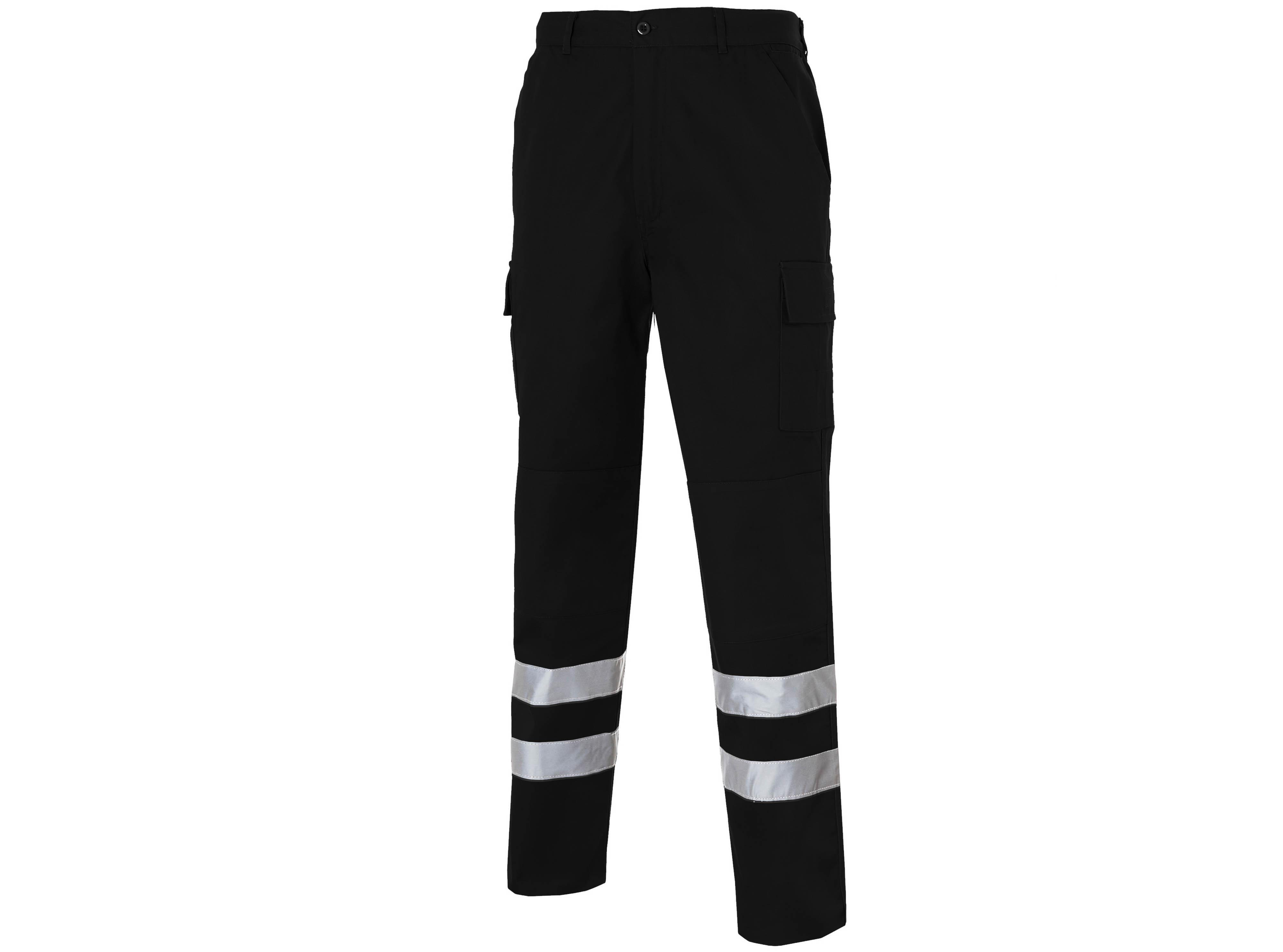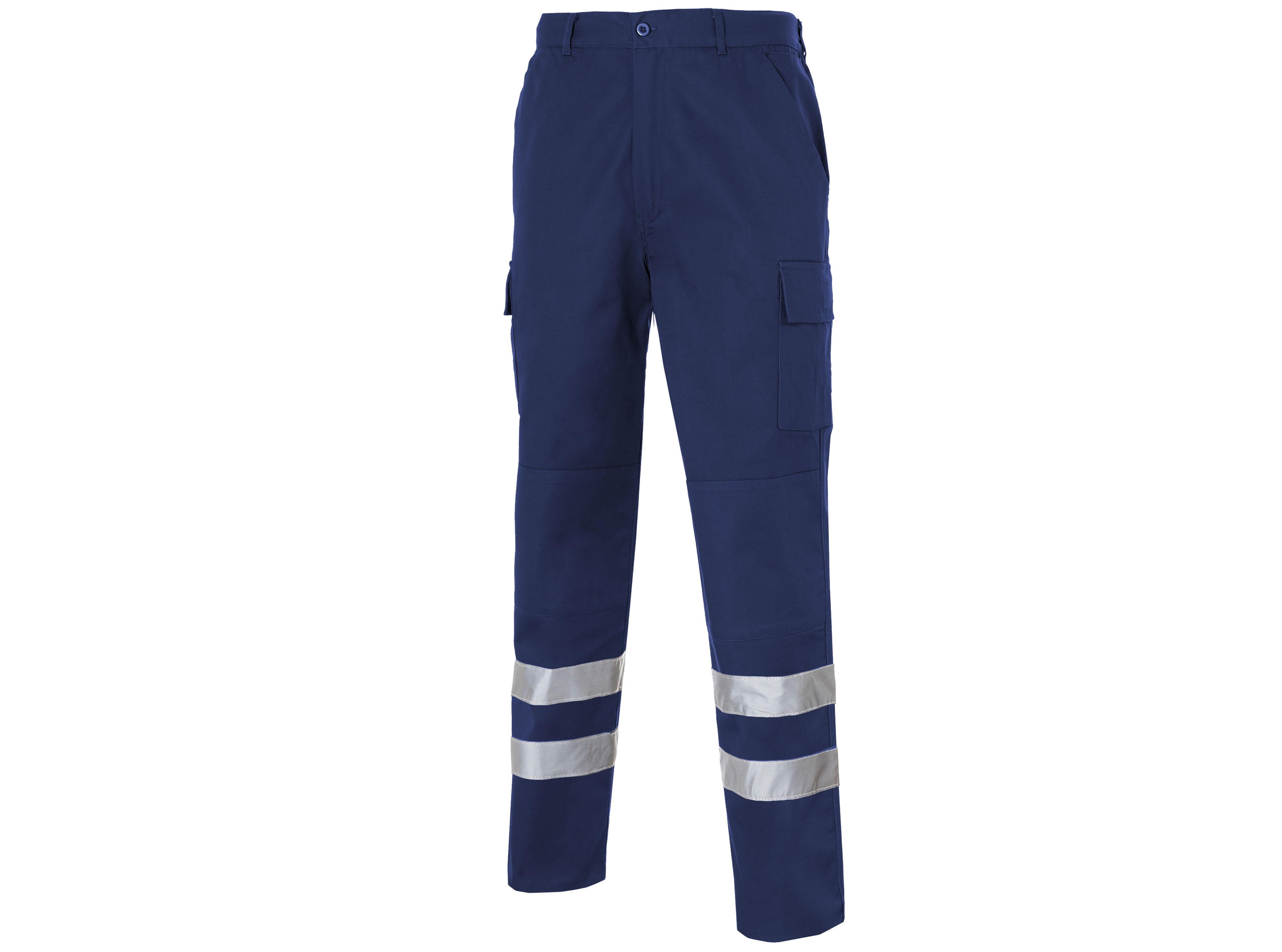 Pantalón gomas laterales, 2 bolsillos delanteros inclinados, relojera, 1 bolsillo trasero de parche con tapeta y clip, 2 bolsillos laterales de parche con fuelle, tapeta y velcro en ambas piernas. Forrería mismo tejido. Refuerzo en culera y rodilleras. 2 bandas reflectantes