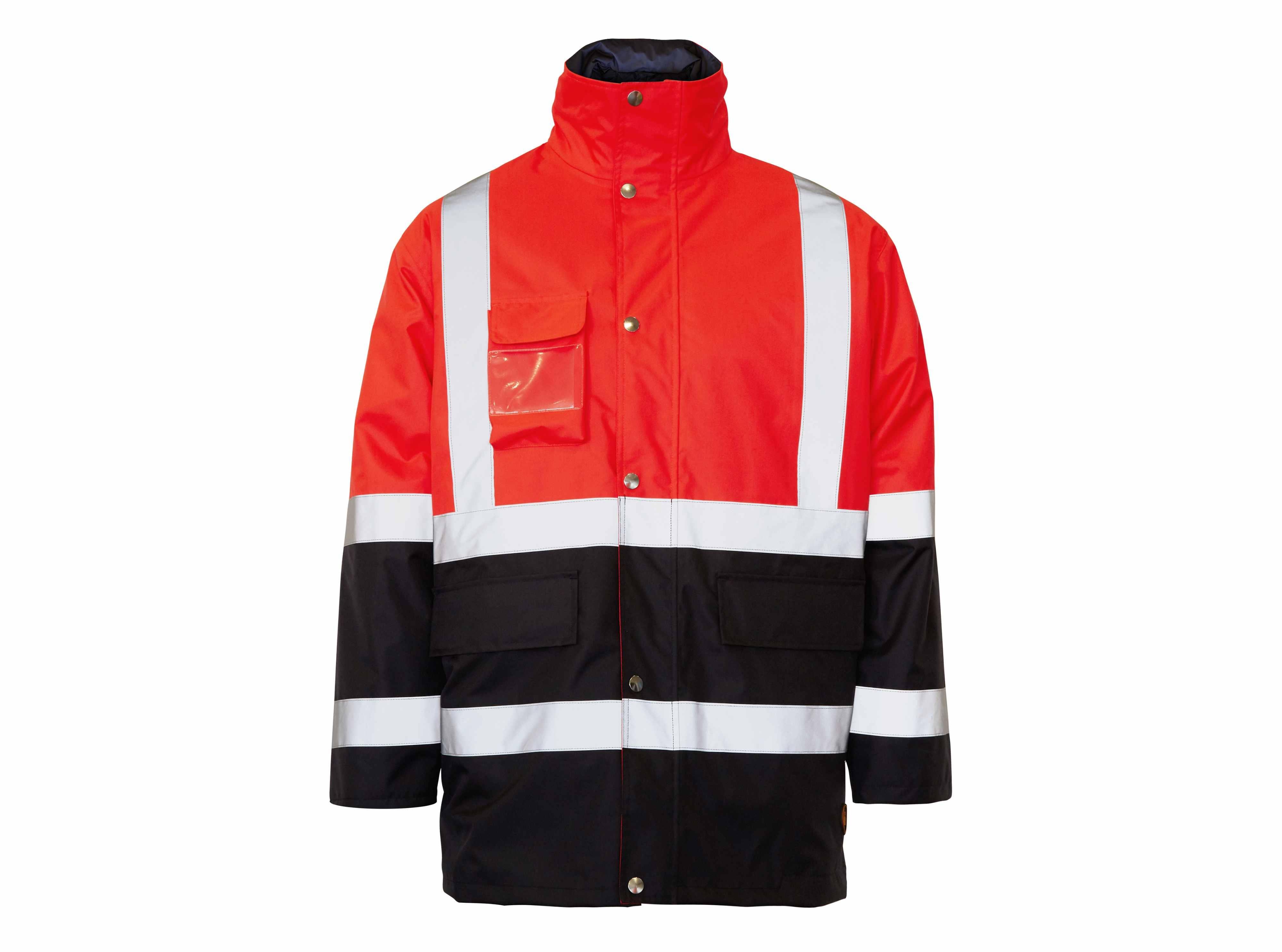 Parka de toile imperméable acolchada bicolore clase II, fermeture fermeture centrale con à rabats et pince, Une poche. tarjetero en poitrine, 2 poches coupées inférieurees con à rabats, Une poche. interior, poignet elástico oculto, col con capucha oculta, respiradero en sisa. 2 bandes réfléchissantes en torse et manches et 2 bandes réfléchissantes tirantes. 300 dinner.
