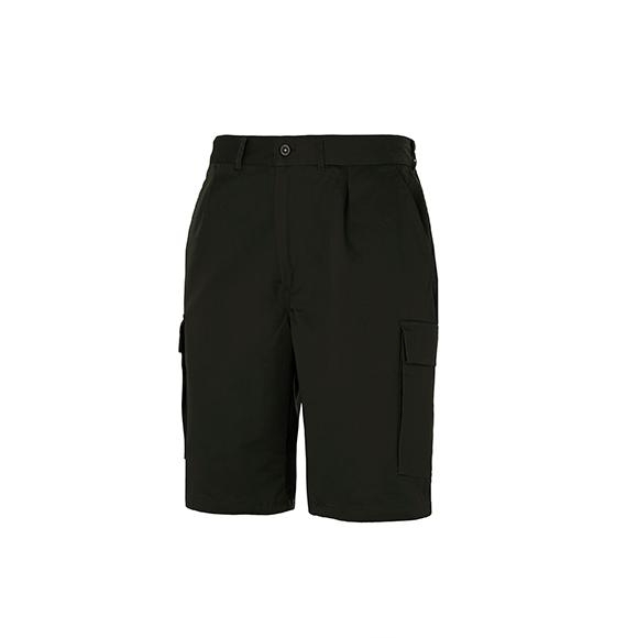 Bermuda shorts 1/2 elastic waist at back, 2 front slant pockets, watch pocket, 1 back patch pocket with clip button, 2 side bellow patch pocket with Velcro flap on each leg. Lining in the same fabric.