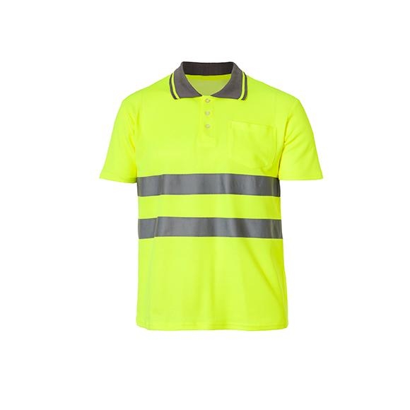 Mesh monocolour short-sleeved, double-side polo shirt, 1 pocket with Velcro on chest, contrasting collar, breathable armhole. 2 reflective stripes on body.