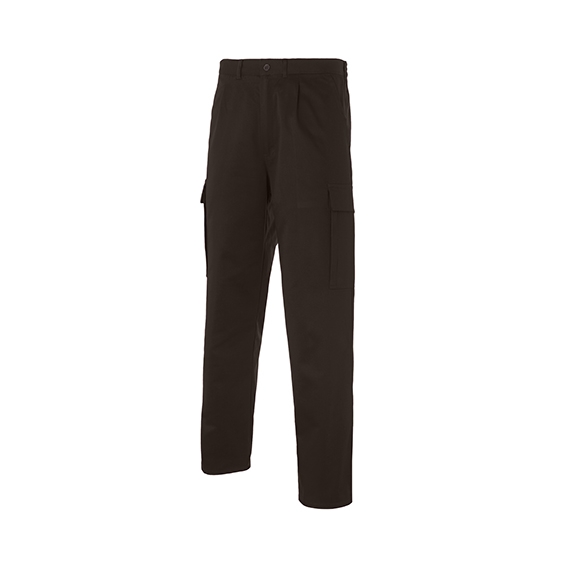 Trousers 1/2 elastic waist at back, 2 front slant pockets, watch pocket, 1 back patch pocket with clip button, 2 side bellow patch pocket with Velcro flap on each leg. Lining in the same fabric.