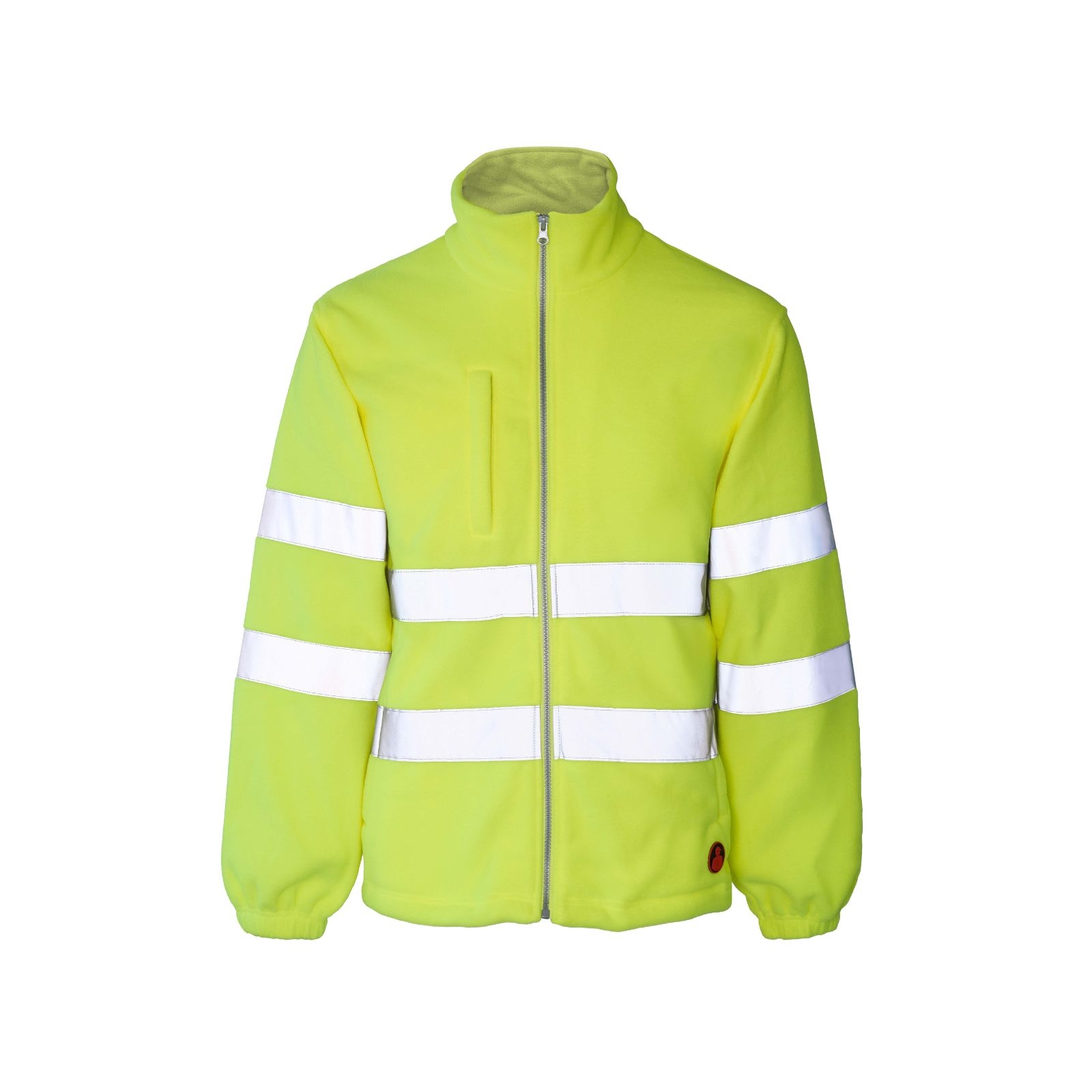 Monocolour polar jacket central zip, 2 side slit pockets with zip, girdle at the waist, elastics cuffs. 2 reflective stripes on body and sleeves.