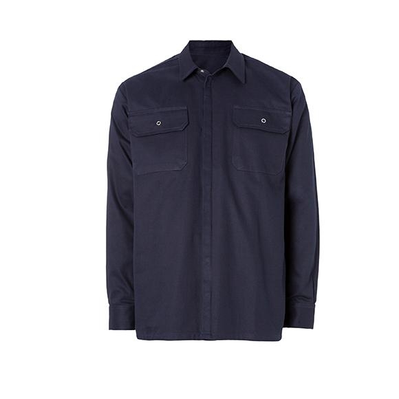 Camisa manga larga con cierre de clip sopatado, 2 bolsillos con cartera y clip, puños cierre de clip oculto, canesú trasero.